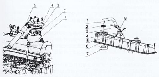 1、曲軸箱通氣管焊接件 2、密封墊圈3、通氣管支架 4、墊圈5、墊圈 6、螺母 7、通風(fēng)管濾清器