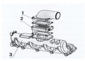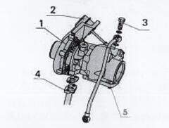 松脫增壓器進(jìn)油管3、回油管4及4只底座緊固螺母5(注意這4個(gè)螺母為耐熱材料制成的特殊螺母,不能丟失或錯(cuò)裝)和增壓器兩端連接管即可把增壓器取下。