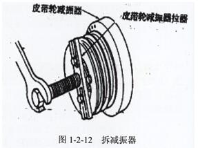 注意:在拉拔皮帶輪減振器時(shí),必須用專(zhuān)用拉拔器靠在皮帶輪減振器的內(nèi)圈上加力,以免損壞減振器內(nèi)外圈之間的橡膠層,造成事故隱患。圖1-2-12。