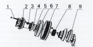 1、螺栓Ml0×75  2、空調(diào)皮帶輪 3、螺栓 4、連接軸 5、圓柱銷(xiāo) 6、硅油減振器  7、皮帶輪 8、曲軸齒輪 9、曲軸