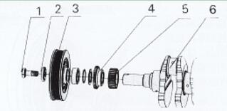 1、皮帶輪壓緊螺栓 2、曲軸頭墊片 3、減振器 4、機(jī)油泵驅(qū)動(dòng)齒輪 5、曲軸正時(shí)齒輪 6、曲軸