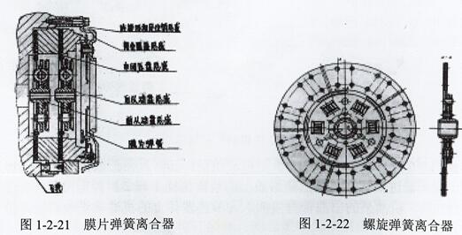 在拆卸離合器前,先拆除飛輪殼或飛輪蓋板上的緊固螺栓(圖1-2-20),把飛輪殼或飛輪殼蓋板取下。拆下離合器壓盤(pán)總成與飛輪聯(lián)接螺栓1和2即可把離合器壓盤(pán)總成及離合器從動(dòng)盤(pán)總成拆下。注意:產(chǎn)品出廠時(shí),廠家對(duì)曲軸、離合器總成及飛輪作過(guò)整體平衡。因此,在拆卸時(shí),特別注意其連接方式及其平衡塊的安裝位置,最好能打上安裝標(biāo)識(shí),以免裝復(fù)時(shí)裝錯(cuò)、裝亂,造成故障隱患。目前配用螺旋彈簧離合器或膜片彈簧離合器(圖1-2-21圖1-2-22),一般情況下,這些離合器都能互換使用。