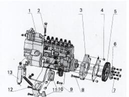 1、噴油泵 2、螺栓Ml0×90 3、聯(lián)接板 4、定位套5、噴油泵齒輪 6、噴油泵正時(shí)調(diào)整板 7、螺栓Ml0×1×308、螺栓Ml0×55 9、螺栓Ml0×40 10、支架子 11、托架12、螺栓Ml0×20 13、斷油管組件