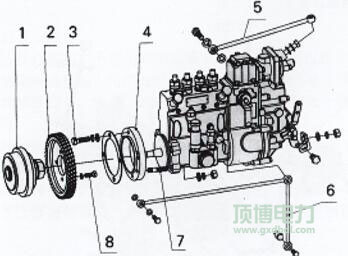 1提前器部件 2噴油泵齒輪 3噴油泵螺固螺栓 4連接板 5增壓補(bǔ)償管 6機(jī)油管 7螺栓 8螺栓